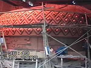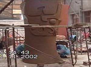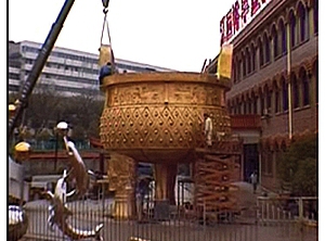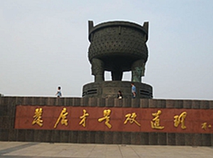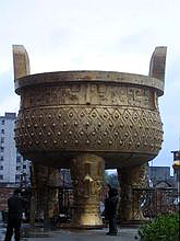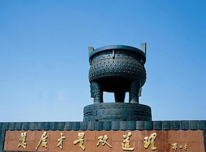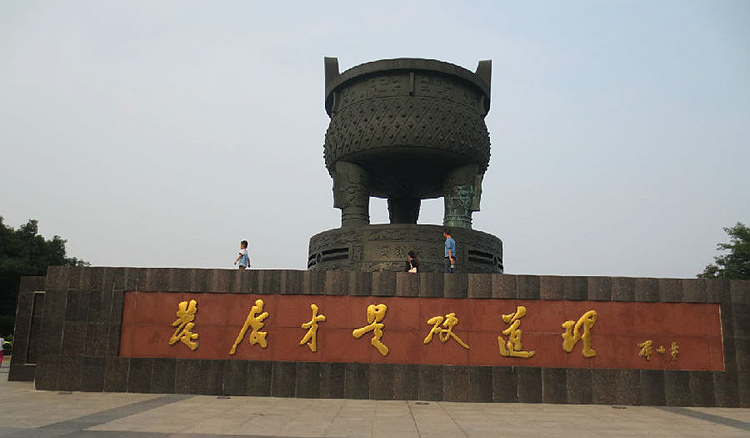 是世界上巨型青銅寶鼎之一,“實事求是”寶鼎,總高度10米(代表紀念鄧小平同志誕辰100周年之意),重41.8噸,鼎高8米,直徑7.04米。它三足鼎立(暗含鄧小平同志三落三起,永遠不倒之意),雙耳高聳(代表鄧小平理論兩個根本出發點“解放思想”、“實事求是”),分別飾饕餮及夔龍紋。頸下飾12條夔龍(中華民族12億炎黃子孫)和六條扉棱(意為"六六大順")。鼎身腹下飾緊密相連,猶似“迷宮”般布局的勾連圖紋,并以4排乳釘紋點綴(代表鄧小平同志一貫堅持的“四項基本原則”)。