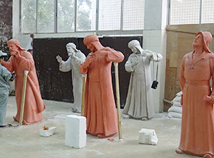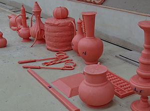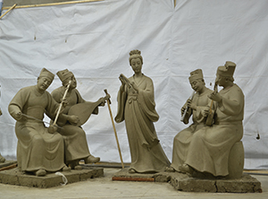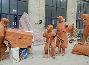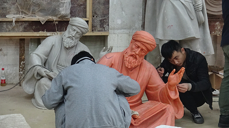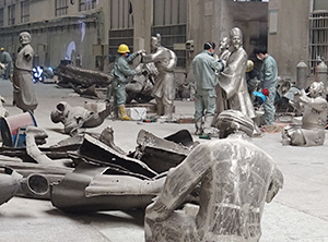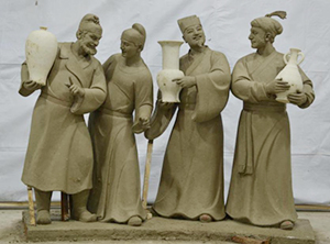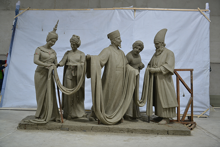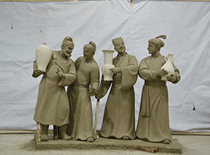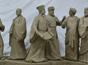 該大型場景商貿群雕由白銅,采用失蠟法精密鑄造而成,歷經十幾道工序。共一百多尊人物(均高約2米)及各類道具組件,規模宏大,人物形態各異,多姿多彩,栩栩如生,各類器物繁多,生動再現了我國古代海路商貿的繁榮景象,獨特的異域風情氣息撲面而來……海上貿易在我國古代由來已久,萌芽于秦漢,發展與唐宋,而尤其以明代鄭和帶領的船隊最為鼎盛。是我國古代海路貿易中最為濃重的一筆。群雕作為歷史回顧與文化傳承,同時彰顯了振興21世紀海上絲路的重要作用!(圖為群雕泥稿及白銅鑄造成品局部)
