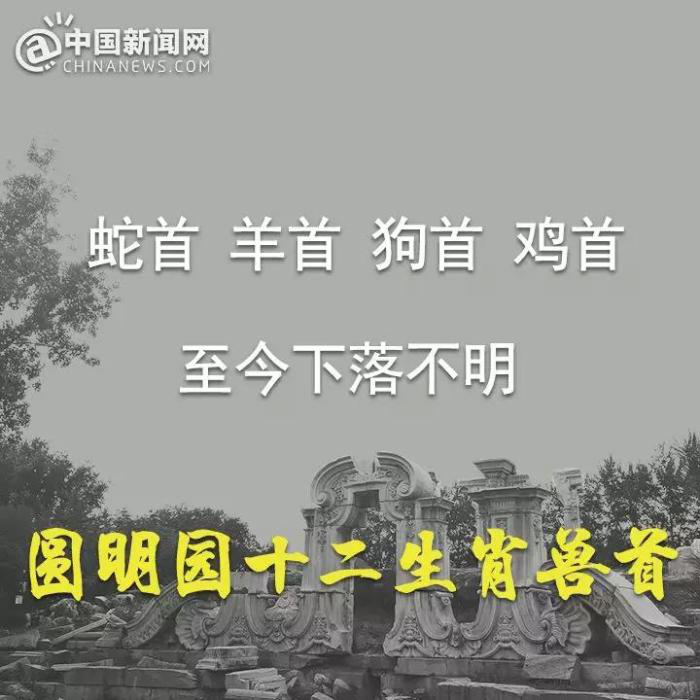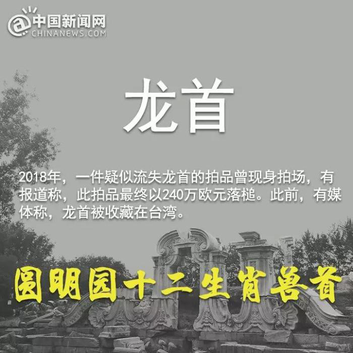 至今,圓明園十二生肖獸首中,鼠首、牛首、虎首、兔首、馬首、猴首、豬首七尊獸首已經回歸。2018年,一件疑似流失龍首的拍品曾現身拍場;蛇首、羊首、雞首和狗首至今下落不明。