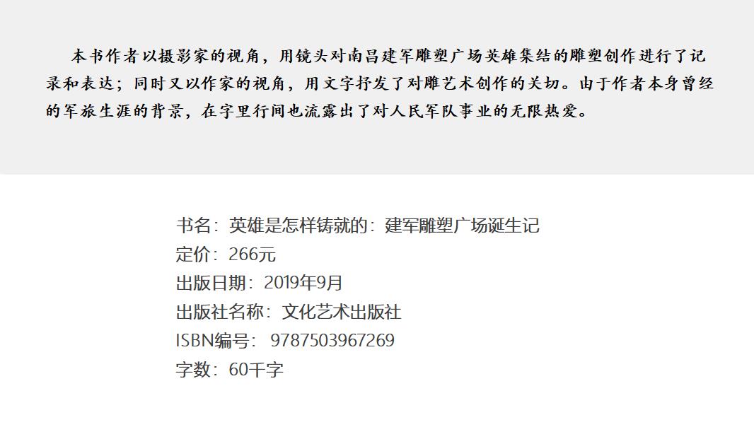 這組雕塑是八一南昌起義暨建軍九十周年紀念日到來之際,在南昌市紅谷灘鳳凰洲市民公園建成開放的。它采取“3+6”框架,東西軸上為“牛行集結”“揮師渡江”“軍旗升起”3座雕塑,南北方位為“星火燎原”“抗戰先鋒”“解放全國”“鋼鐵長城”“精兵之路”“強軍興軍”6座雕塑。整個雕塑群是由中央美院雕塑系教授孫偉帶領130多人的團隊,經過3年時間完成的。而本書作者羅水長則是用鏡頭全景式記錄英雄“誕生”的唯一攝影家。